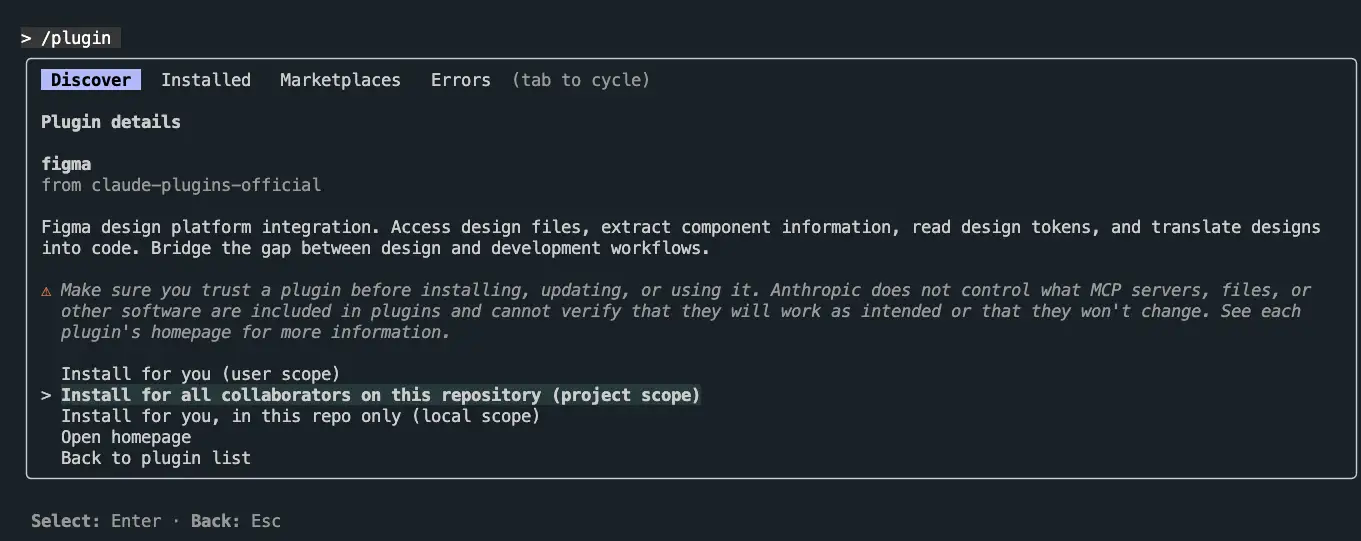 Figma の Skills はプラグイン として提供されているため、Claude Code を起動して /plugin コマンドを実行することでインストールできます。