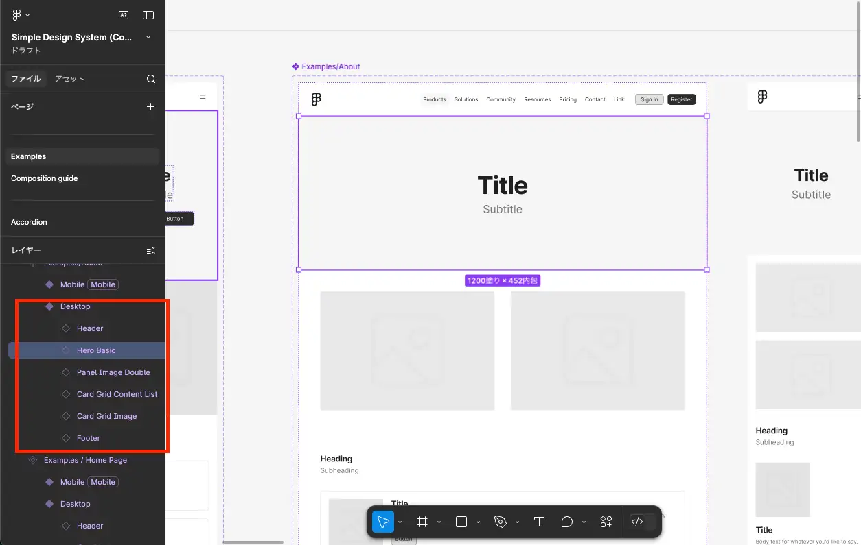 parameters to read specific portions of the file, or use the GrepTool to search for specific content.この場合はページを構成するコンポーネント単位で分割して実装してもらうようにしましょう。例えば Examples/About Page フレームは Header, Hero Basic, Panel Image Double, Card Grid Content List, Card Grid Image, Footer の 6 つのセクションに分割されているため、これらのセクション単位で分割して実装してもらうとより正確にコンテキストを把握してもらいやすくなるでしょう。このことは Figma でデザインを作成するときも意識しておくと良いでしょう。適切にレイヤーが分割されていれば AI エージェントに指示を出しやすいだけでなく、人間が実装する場合も理解しやすくなるはずです。