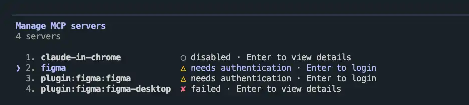 }Claude Code を起動して /mcp コマンドを実行し、Figma MCP サーバーがリストに表示されていることを確認しましょう。