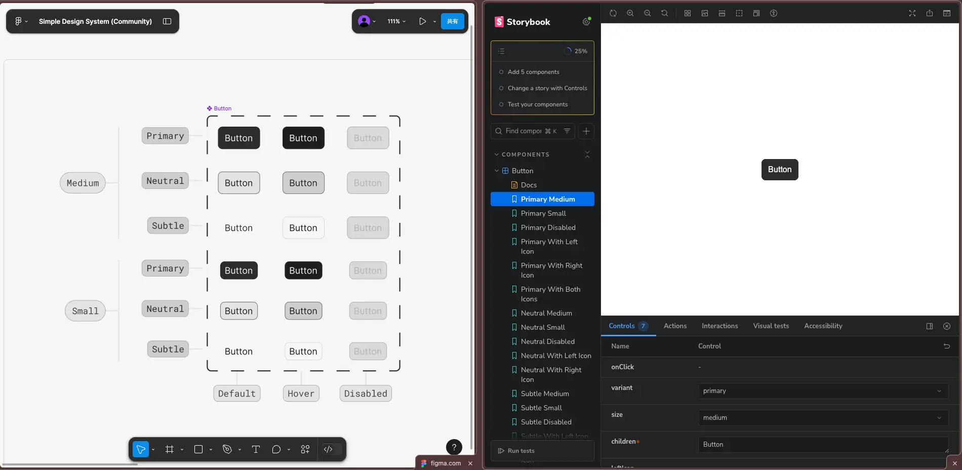 Figma のデザインを取得できました。Button コンポーネントには Primary、Neutral、Subtle の3つのバリエーションと、Default、Hover、Disabled の3つの状態、そして Medium と Small の2つのサイズがあります。実際に作成された Button コンポーネントと Story は以下の通りです。