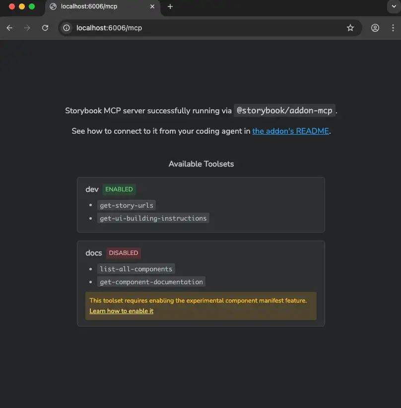 export default config;Storybook を起動します。http://localhost:6006/mcp が MCP サーバーのエンドポイントとして追加されていることがわかります。