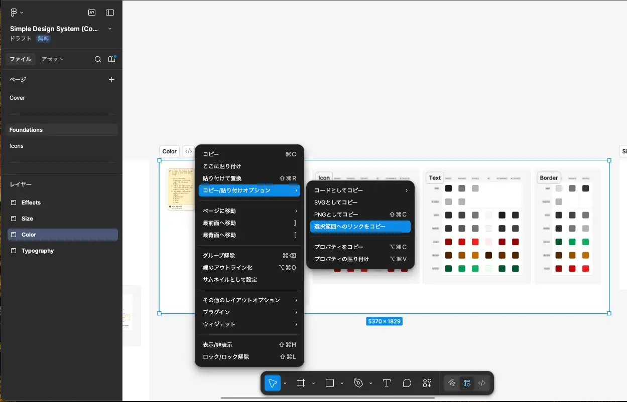 Figma ファイルの Color レイヤーのリンクを取得し、そのリンクを Claude Code へのプロンプトに含めて指示を出します。レイヤーのリンクを取得するには、Figma ファイルを開き、Color レイヤーを選択した状態で右クリックし、「コピー/貼り付けオプション」>「選択範囲へのリンクをコピー」を選択します。