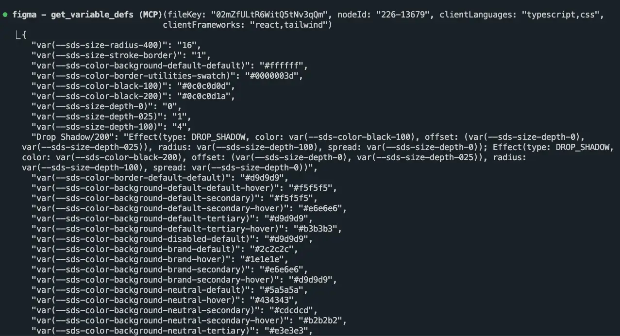 get_variable_defs ツールのレスポンスを見てみると、CSS 変数の形式でデザイントークンが取得できていることがわかります。