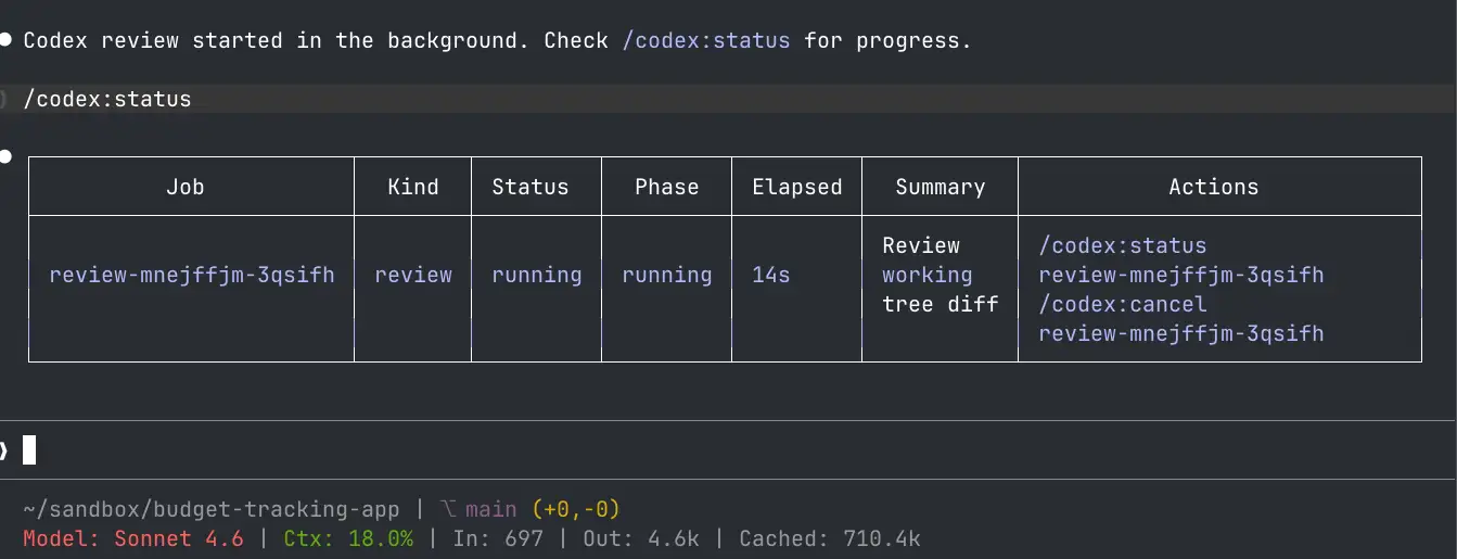 Once the review target is decided, createCompanionJob is called to create a review job. Here, a job is the unit used to manage Codex execution. Managing it as a job makes it possible to check progress with /codex:status or cancel it with /codex:cancel when needed.